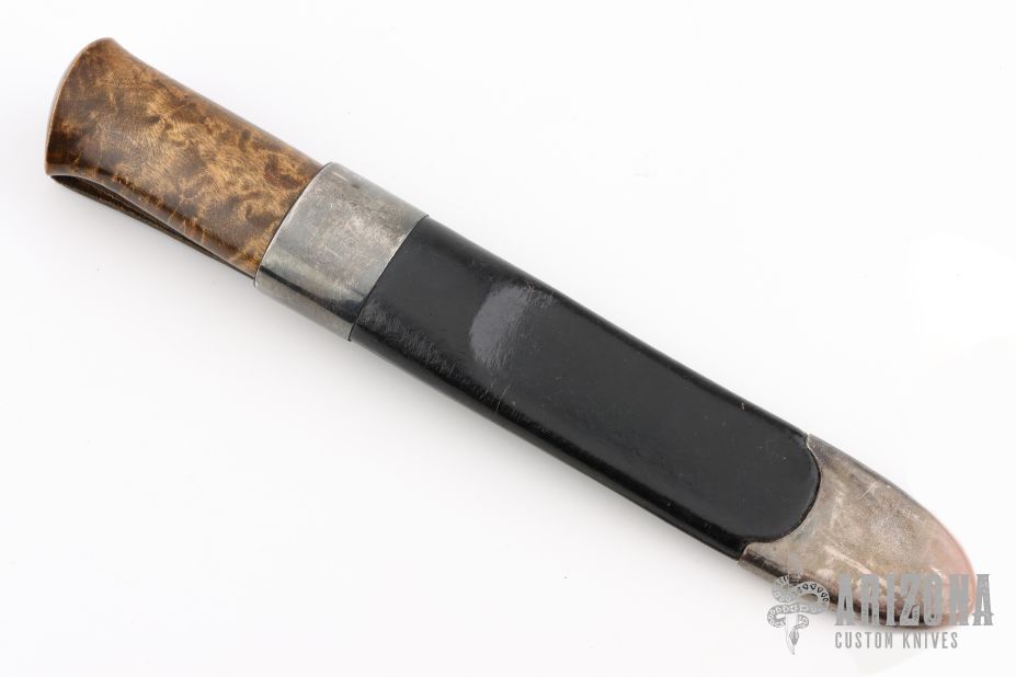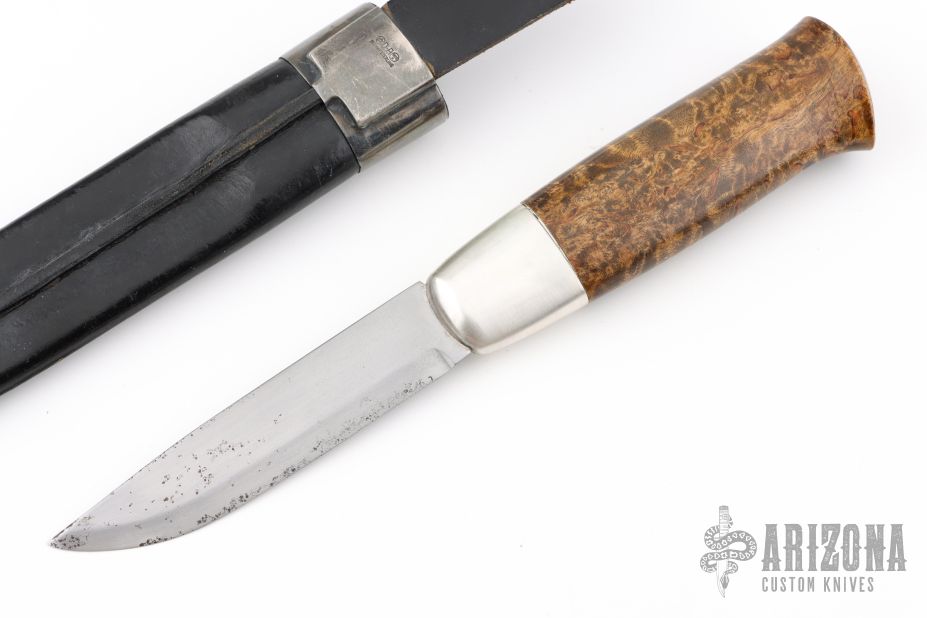 The belt knife by David Ansersen features a drop point blade with hidden tang construction, .114" Blade Stock .838" Blade Depth. The handle is composed of a nickel silver ferrule, and wood grip. Includes a brown leather sheath with Norway Sterling Silver 92.5%. Blade has pitting, has been resharpened, knife has scratches, and patina. Good condition otherwise.