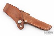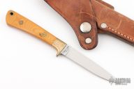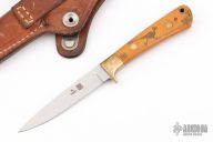 This 5002 Road Runner by Al Mar features a mirror polished drop point blade with notched thumbrest, .105" blade stock and .589" blade depth, full tapered tang construction. The handle has brass bolsters and ivory paper micarta scales with brass pins and lanyard hole. Handle has a scrimshaw scene. Comes with original leather sheath. Has scuffs, scratches, and patina. Great condition otherwise.