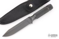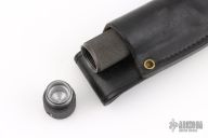 3/16" blade thickness and 7/8" blade depth. False top edge. Notched thumbrest. Butt cap unscrews allowing access to the inside of the hollow handle. Includes original sheath. Has some light scratches and a few small oxidation spots, otherwise good condition.