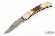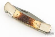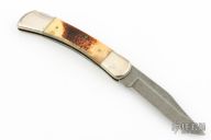 This lockback from Parker-Edwards features a rough finish Damascus clip point blade with nail nick. The handle is comprised of nickel silver caps and bolsters with jig bone covers over brass liners and steel spring. Has scuffs, scratches, and patina. Good condition for its age.