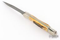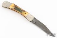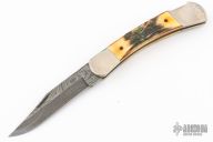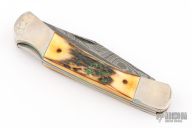 This lockback from Parker-Edwards features a rough finish Damascus clip point blade with nail nick. The handle is comprised of nickel silver caps and bolsters with stag covers over brass liners and steel spring. Has scuffs, scratches, and patina. Good condition for its age.