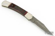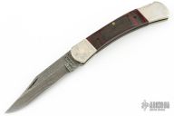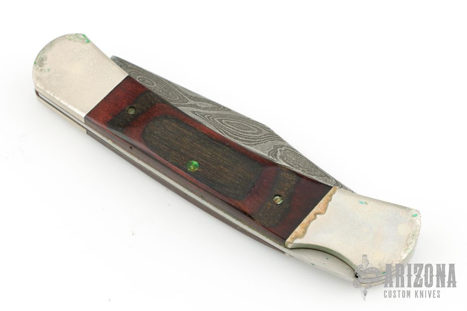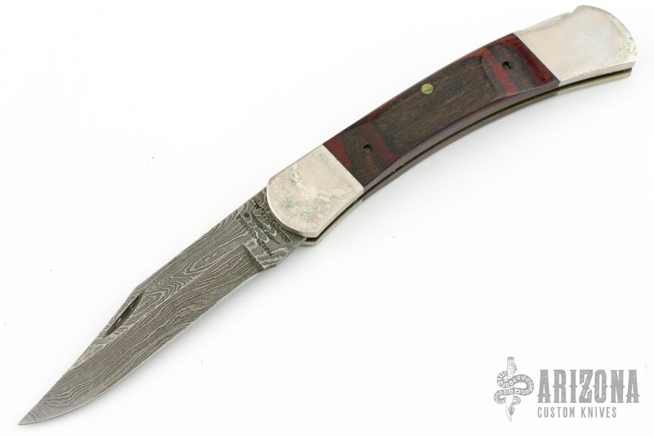 This lockback from Parker-Edwards features a rough finish Damascus clip point blade with nail nick. The handle is comprised of nickel silver caps and bolsters with wood covers over brass liners and steel spring. Has scuffs, scratches, and patina. Good condition for its age.