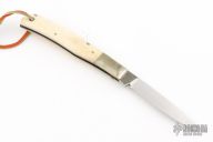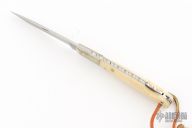 This Lockback from Shane Sloan features a satin finished blade with nail nick. The handle has stainless steel bolsters, bone scales, stainless steel liners and spring/backspacer. Spring has been file worked, and there is a lanyard hole in the pommel. Has scuffs, scratches, and patina. Great condition otherwise.