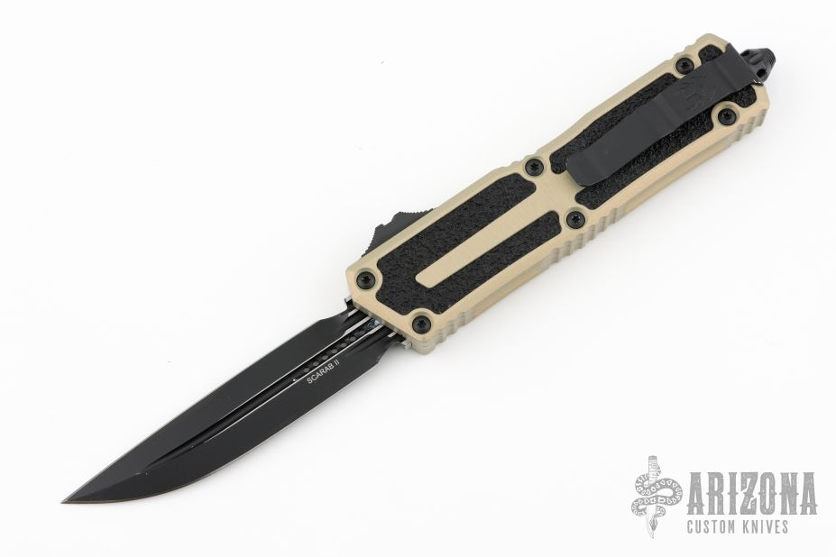 The Microtech Scarab II was designed to embody the best of each Microtech knife style and does so fantastically! This third generation version has been upgraded with a super smooth, super strong double spring system powerful enough to fire the blade underwater. Contributing to the smooth action is the milling in the thumb slide cut-out; affectionately dubbed the "crud cutter," it reduces friction while breaking apart lint and other debris to facilitate consistent, effortless operation. The Scarab II's handle has chamfered edges set with 3M inlays, which enhance grip purchase without tearing apart your hand or pocket. If you're looking for meaty, if you're looking for mighty, if you're looking for excellent, then congratulations—you've found it.