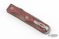 This EK Folder by Allen Elishewitz features a Black Snow finished blade with fullers, false top edge and a thumbdisc. The handle has black/red fat carbon scales patterned after an EK Knives dagger, textured and anodized titanium liners, tip up black stainless steel clip, black G-10 backspacer. Rides on bearings, nice detent, lockup and blade seating. Comes with velcro case. Excellent condition.