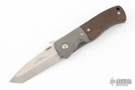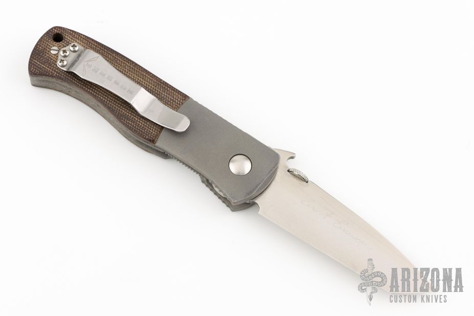This Custom CQC-7 by Emerson Knives features a chisel ground satin finished tanto blade with notched thumbrest, wave feature and thumbdisc. The handle has bead blasted and dovetailed titanium bolsters, green canvas micarta scales, bead blasted titanium liners, black G-10 backspacer, tip up stainless steel clip. Comes with original box. Has a few light scuffs, otherwise excellent condition. The blade is signed by Ernie Emerson.