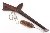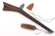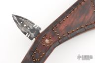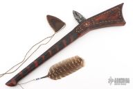 This Gun Stock War Club by Ryan Johnson features a File Branded hickory handle and head, with forged 1084 blade held fast with pewter, and brass tack embellishments. Turkey feather, and bead drop hang from the pommel. Comes with sewn leather sheath. The blade is 2.75" tall, 1.75" wide, with .196" blade stock, hidden tang. From the bottom of the knife, to the end of the handle is 18.5". The club head is 9" from the top of the knife and is 5" at its widest. Like new from maker. What a weapon!