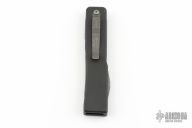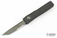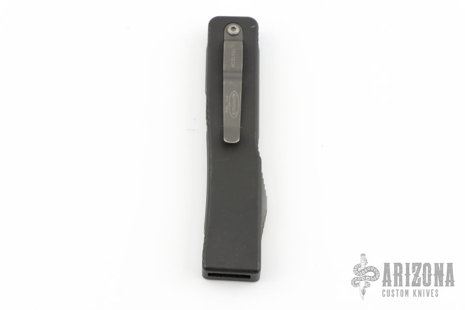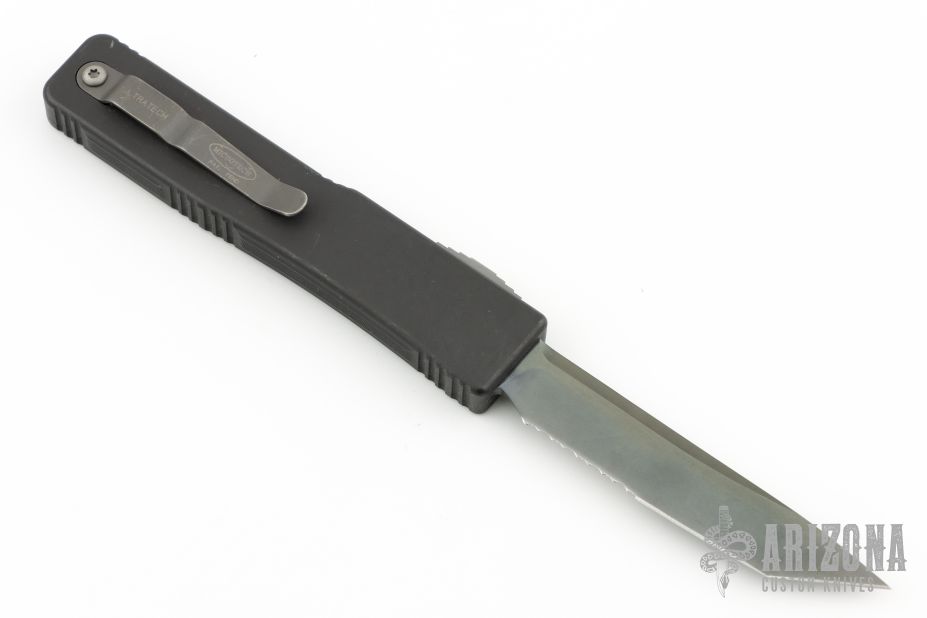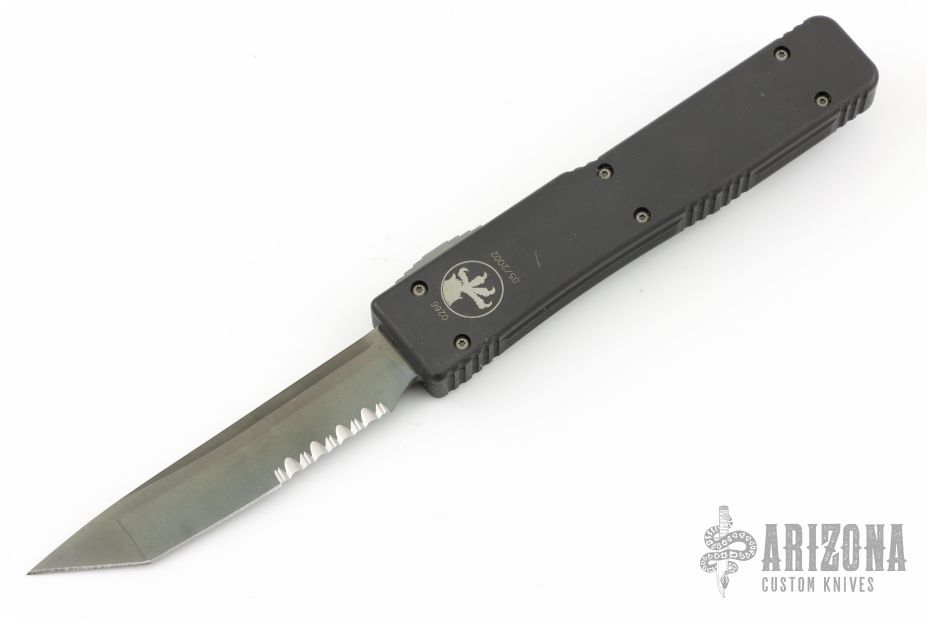 This Early Ultratech by Microtech Knives features a tanto partially serrated blade with swedge. The handle has a black anodized aluminum with ramped steel thumb slide and tip down clip. S/N of 0266 dated 05/2002. This knife was Pre proprietary screws. Has scuffs and scratches, fair condition; good user condition otherwise.