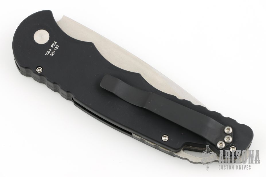 This Tactical Response 4 has a stonewashed partially serrated blade, and a black aluminum handle. Black stainless steel clip, tip up carry. Steel glass breaker. Secondary safety switch. Has a few light scuffs on the handle, otherwise excellent condition.