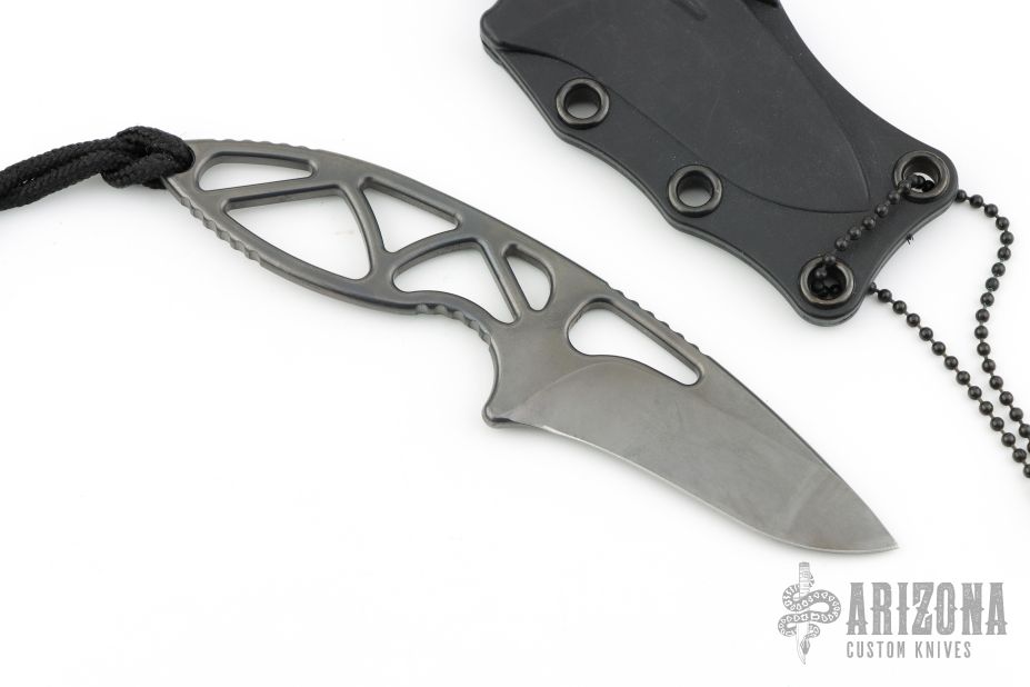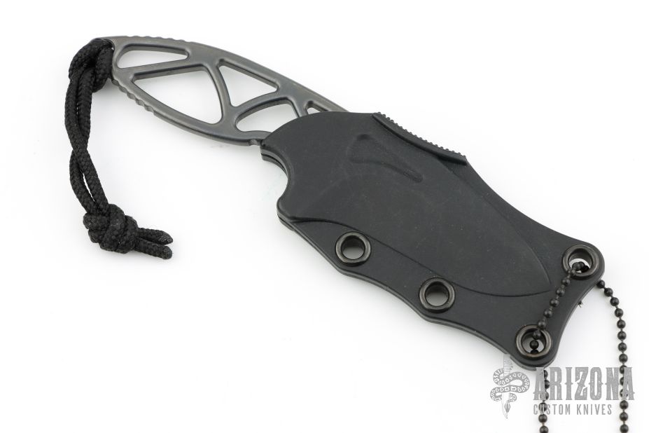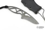 This Medallion neck knife has a black stonewashed blade with notched thumbrest, .157" blade stock and 1.299" blade depth, full skeletonized tang construction. Dated 08/2001 and s/n 0728. Comes with original kydex sheath/ball chain. Excellent condition.