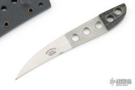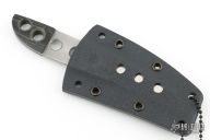 This neck knife from Bud Nealy features a hand rub satin finished  blade with .091" blade stock and .710" blade depth, full tang construction. The handle has black/green G-10 scales. Comes with a magnetic kydex sheath. Numbered 3977. Has some light scratches, otherwise excellent condition.