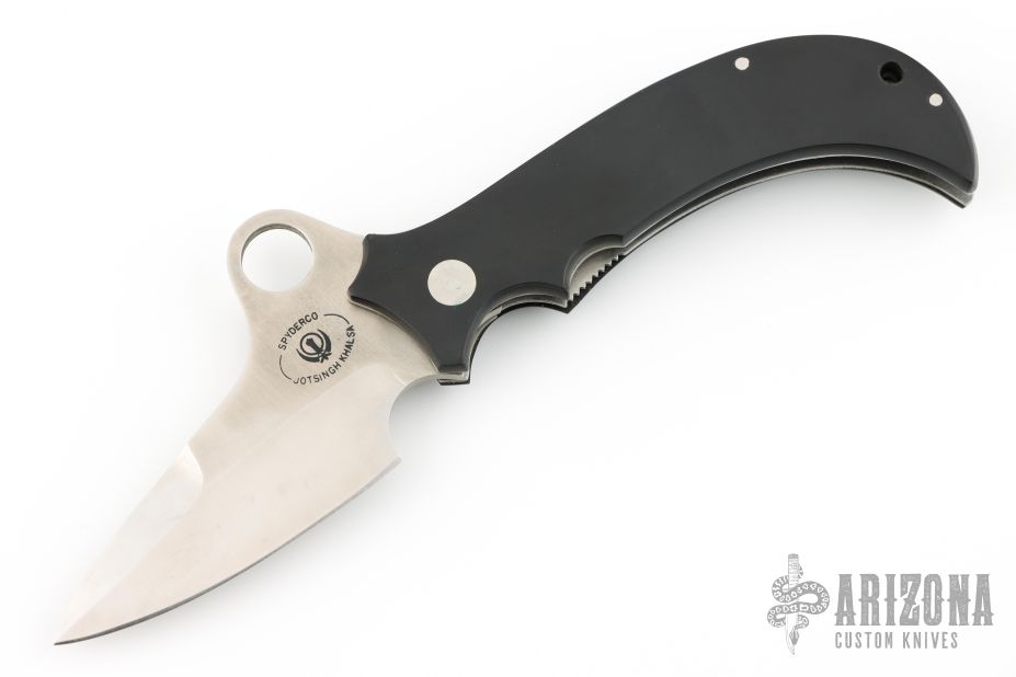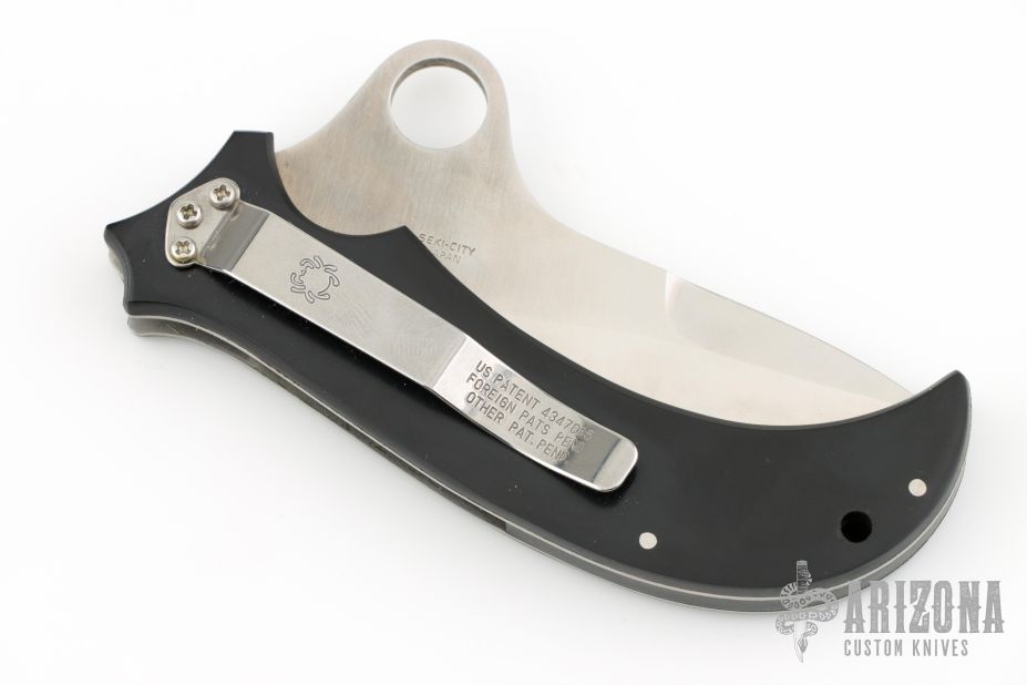 This knife by Spyderco is a Jotsingh Khalsa design, it features a satin finished blade with a thumbhole. The handle has black paper micarta scales, stainless steel liners and a stainless steel tip down clip. Nice detent, lockup and blade seating. Comes with original box and papers. Excellent condition.