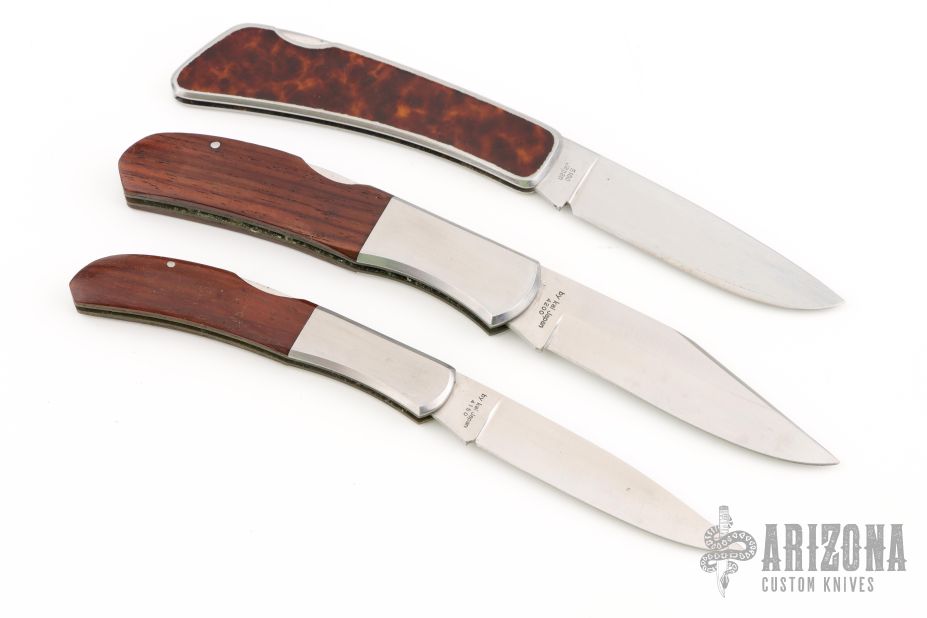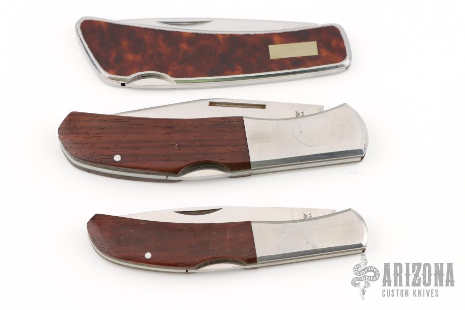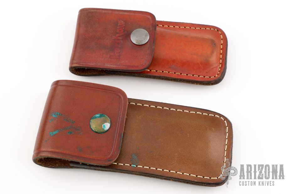 4100 and 4150 come in Kershaw leather belt sheaths, they have wear and verdigris. All the knives have scuffs, scratches, and patina. Fair condition, good user condition otherwise.
