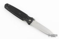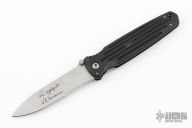 This Applegate Fairbairn Combat Folder by Gerber has a bead blasted stainless steel partially serrated spear point blade with dual thumb studs and false top edge. Handle is black contoured polymer with single stainless steel liner and lanyard hole. Comes with original box and sheath. Excellent condition.