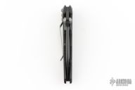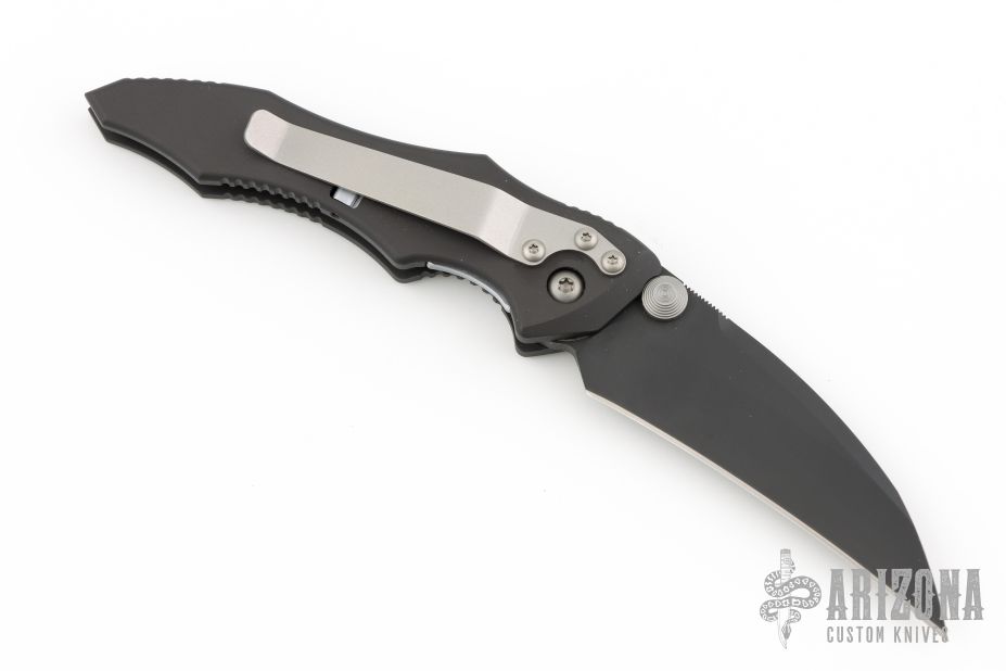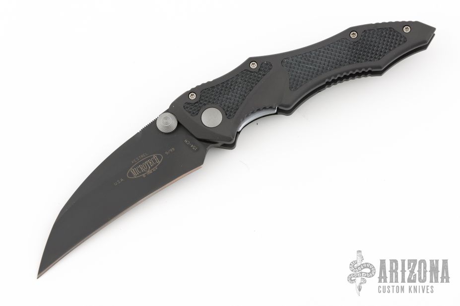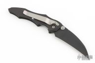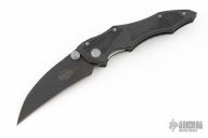 This Kestrel linerlock folder from Microtech has a black coated 154-CM stainless steel hawk-bill plain edge blade with dual thumb studs. Handle is black aluminum with non-slip inserts, stainless steel tip down clip, and green standoffs. Dated 9/99. Comes with original box, papers and sheath. Excellent condition.