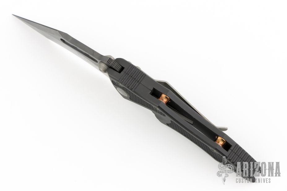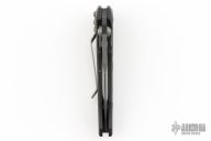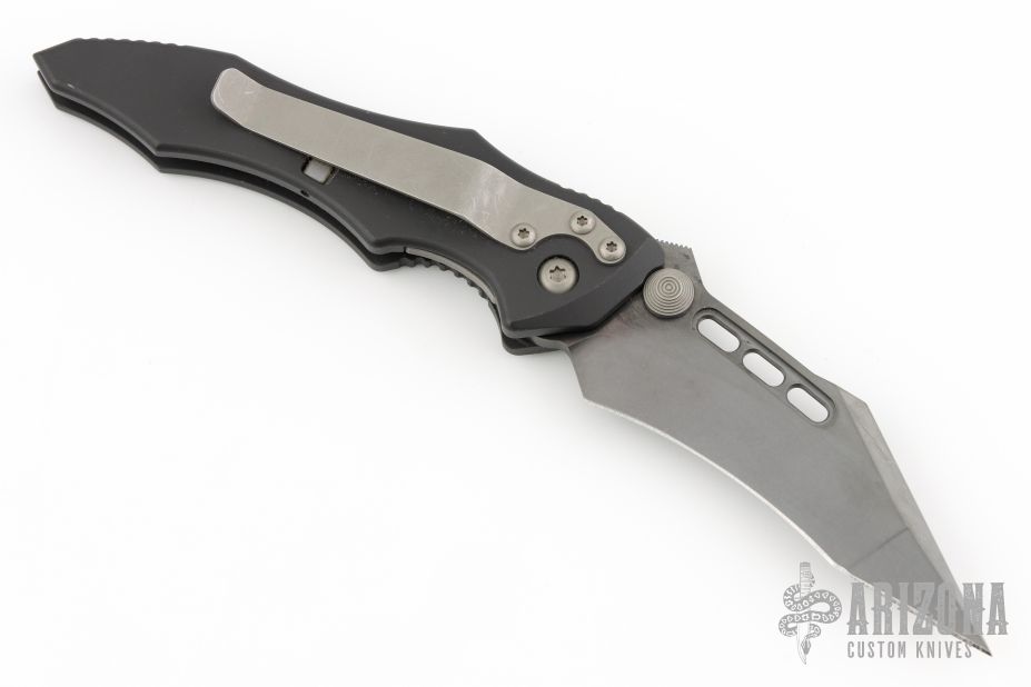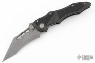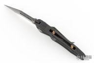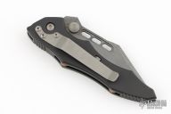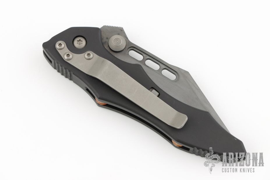 This Vector manual folder from Microtech features a black stonewash finished blade with dual thumb studs and notched thumb ramp. The handle has a black anodized aluminum frame with rubber inserts over bronzed barrel spacers. Stainless steel inlaid lockbar. Tip down stainless steel clip. Comes with original box, papers and nylon sheath. Has a few light scuffs, otherwise excellent condition.