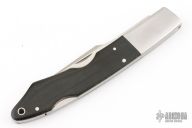 This Lockback folder from G Sakai features a satin finished blade with nail nick. The handle has stainless steel bolsters, black linen micarta scales, stainless steel liners, stainless steel backspacer. Comes in maker's nylon belt sheath. Has scuffs, scratches, and patina. Good user condition.