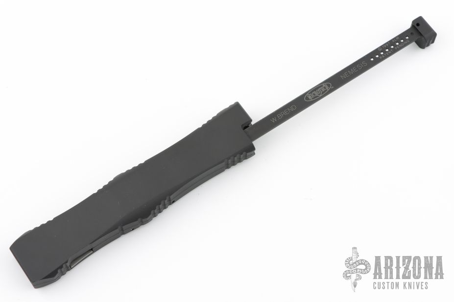 This Nemesis III by Microtech Knives features a Walter Brend hand-ground hand rub satin finished double edged blade with fullers. The handle has a black aluminum frame with safety and charging handle. Dated 1/99. Marked "W. Brend" on charging handle. Number 525. Excellent condition.