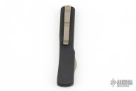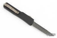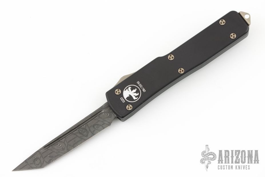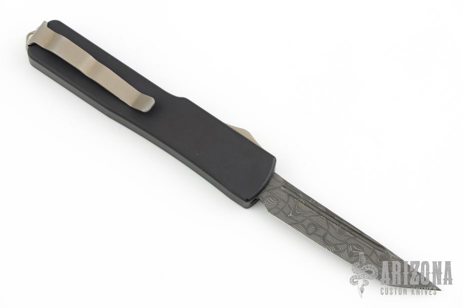 This UTX-70 has a tanto edge Damascus blade with fullers. The handle has a black aluminum handle with bronzed SS hardware and tip down bronzed stainless steel clip. Dated 06/2010, serial #020. Comes with original box, sheath and papers. Excellent condition.