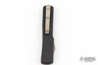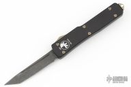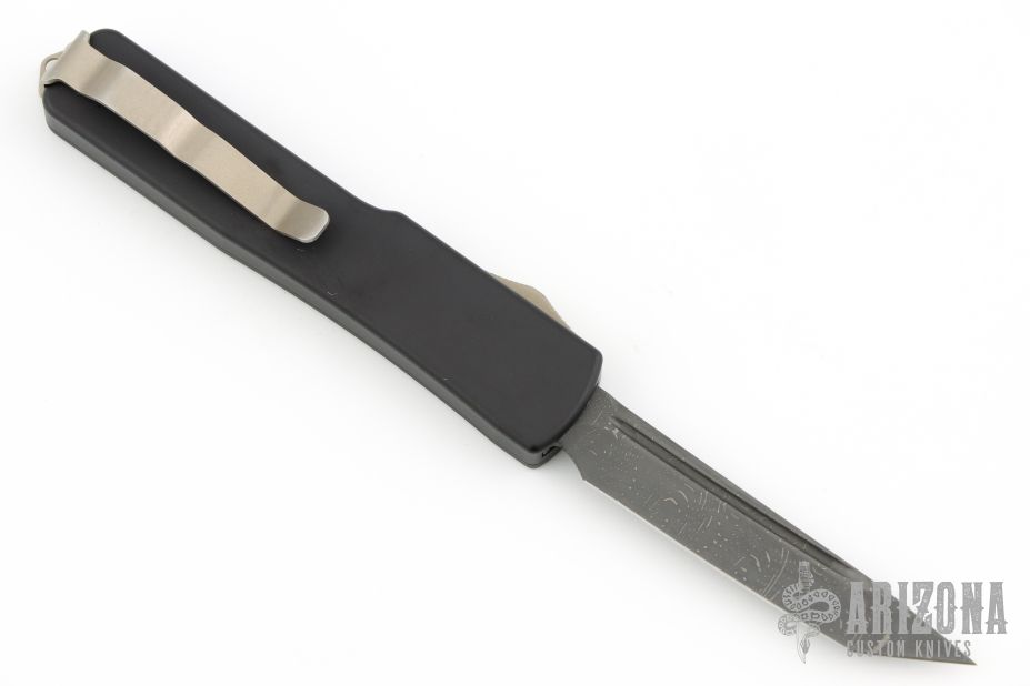 This UTX-70 has a tanto edge Damascus blade with fullers. The handle has a black aluminum handle with bronzed SS hardware and tip down bronzed stainless steel clip. Dated 06/2010, serial #032. Comes with original box, sheath and papers. Excellent condition.