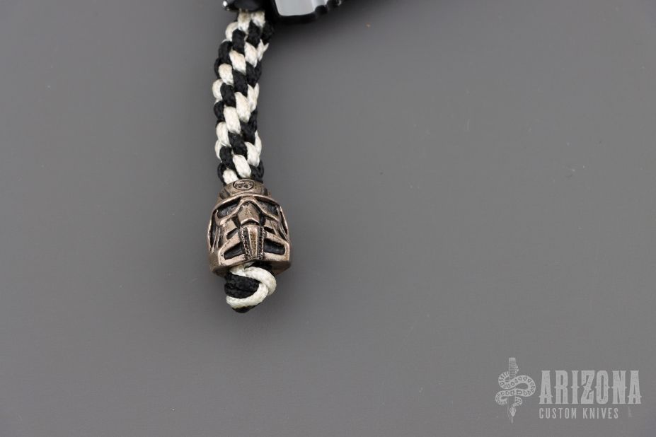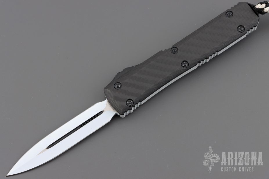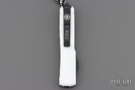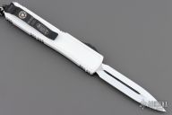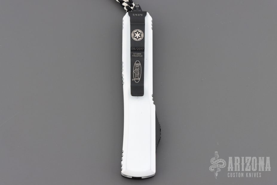 This Microtech Custom Shop Storm Trooper Ultratech features a double-edged dagger blade with a white finish and plain edges. It has a contoured, white finished alloy handle with a carbon fiber top scale and ringed hardware. Microtech equipped this version of the ever popular Ultratech D/A OTF knife with a smooth, contoured handle design that promotes increased comfort during use. This custom Ultratech model provides the same dimensions, hardware, and durability offered by the "Tri-Grip" variation, but goes easier on the hands and pockets. Comes with original Marfione box, zippered case and papers. Comes with .925 silver bead (which you can see in the pictures). Excellent condition. Dated 09/2017 and S/N 079. 100 were made.