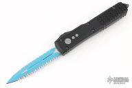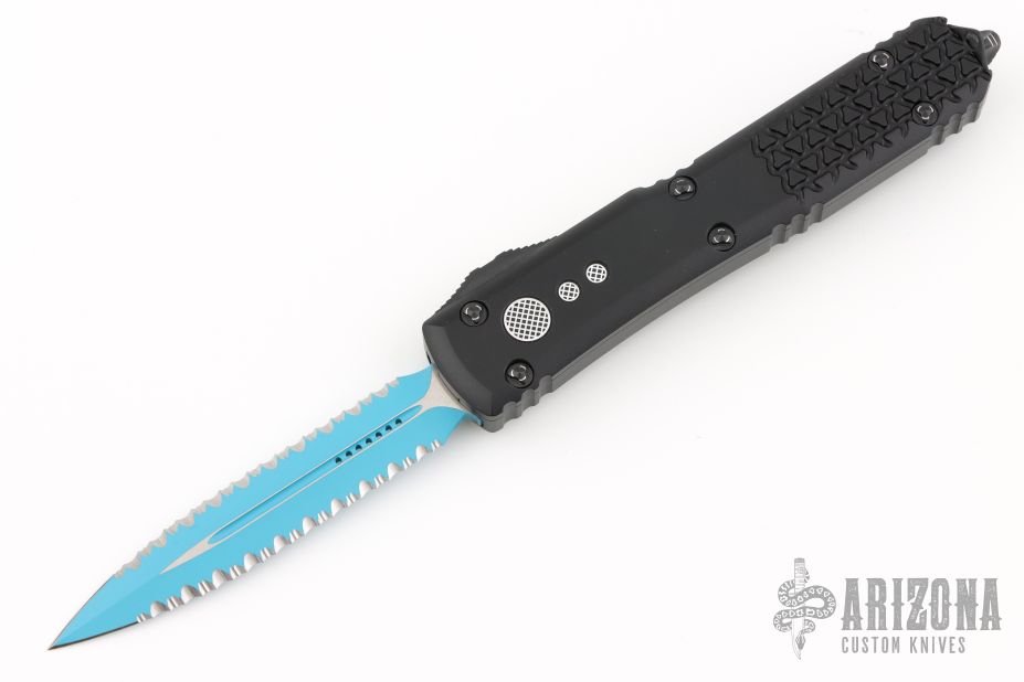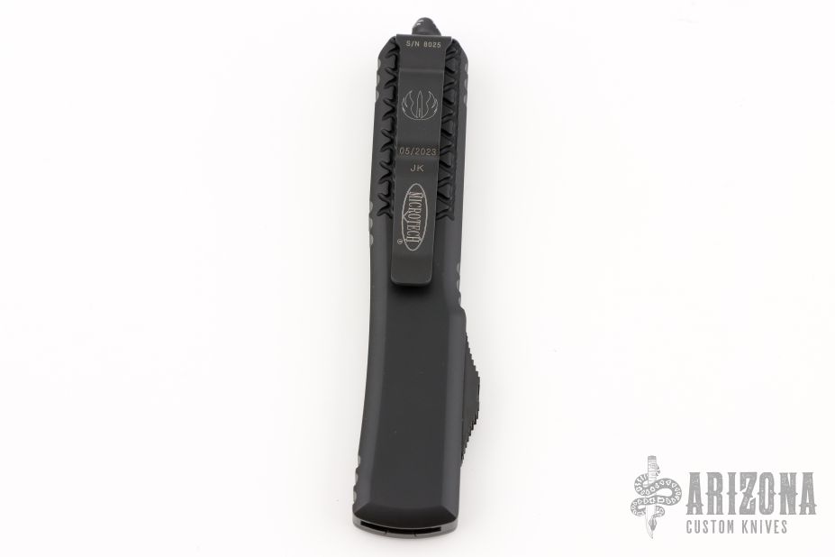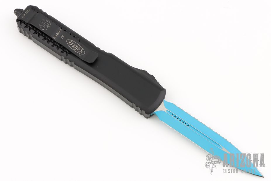 This Ultratech OTF automatic by Microtech features a D/E blue blade with a double fully serrated blade. Black aluminum contoured frame with tip down stainless steel clip. Dated 05/2023 and s/n 8025. Includes original box and papers. Excellent condition.
