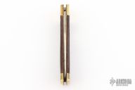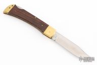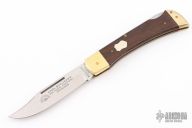This Lockback folder by Carl Schlieper features a mirror polished blade with satin bevels, and nail nick. The handle has brass bolsters front and rear, wood covers, brass liners and a stainless steel spring. Has some light scuffs, scratches, and patina. Great condition otherwise.