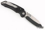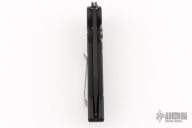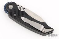 This MRX by Rat Worx features a black clip point blade with satin flats. The handle is black aluminum with a chain drive opening mechanism. Tip up stainless clip. Comes with zippered case. Has some light scuffs, otherwise excellent condition.