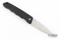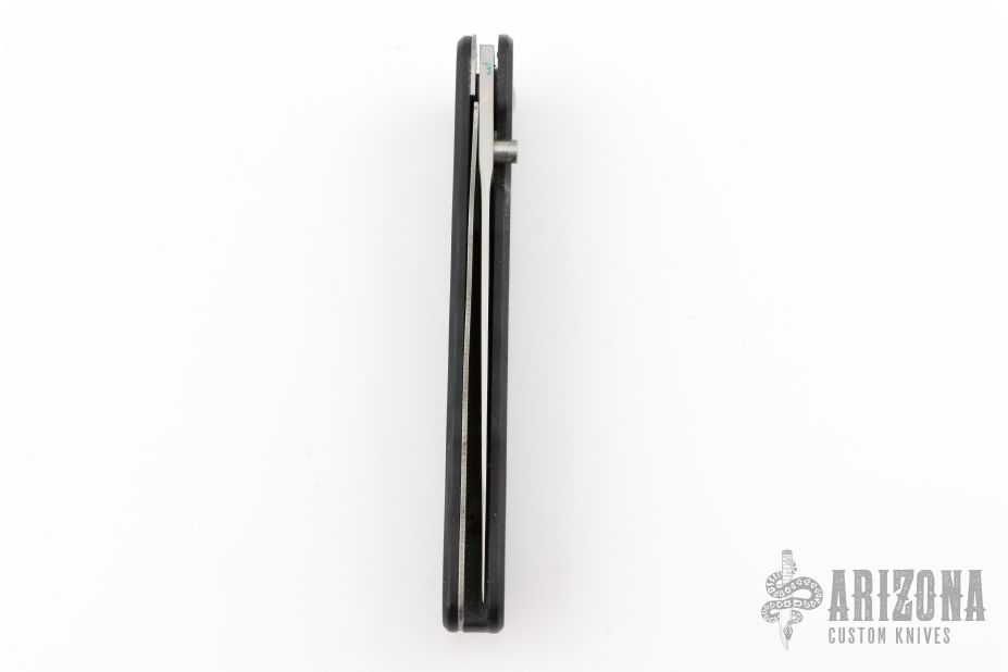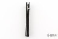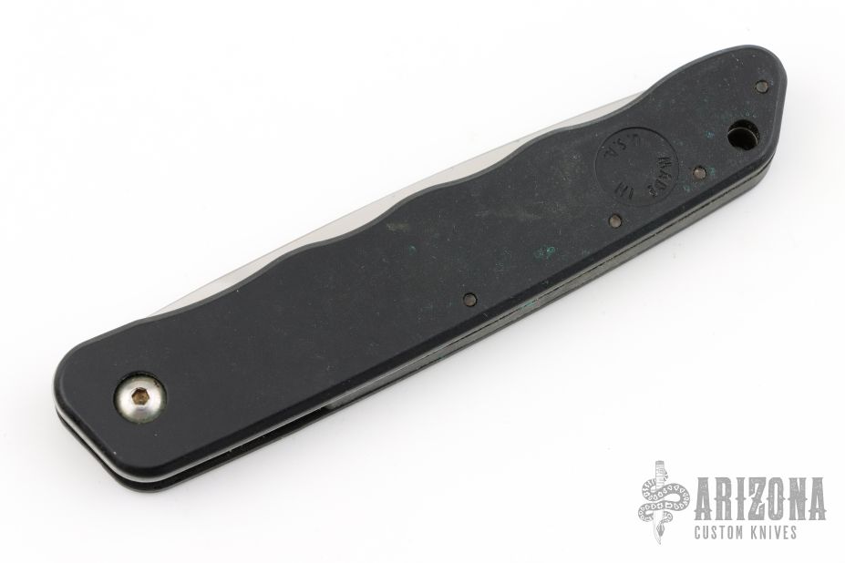 This Back Alley Fighter by Koncept Knives features a satin finished spear point blade with single thumb stud and a false top edge. Black aluminum frame with single bead blasted stainless steel liner. Has scuffs and scratches, good condition otherwise.