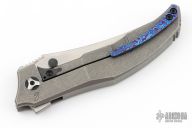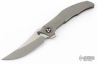 This Persian by Custom Knife Factory is a Peter Rassenti Design.  The knife has a two-tone finished blade with a notched thumbrest and flipper. The handle has a tumbled titanium frame with tip up zircuti clip, lanyard hole, stainless lock face insert with overtravel stop.  Zircuti pivot collars. Rides on bearings, nice detent, lockup and blade seating. #59 on flipper tab. Comes with nylon Velcro case, extra hardware and COA Dated 12/24 and #212. Excellent condition.
