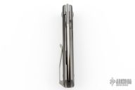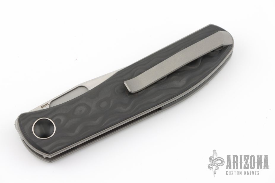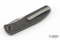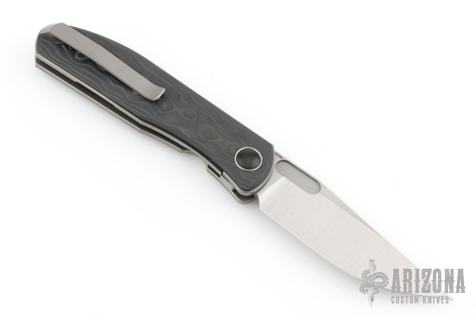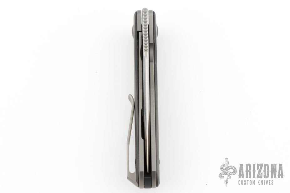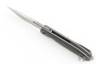This XYRO by Reate is a Gareth Bull design, it has a satin finished blade with notched front flipper. The handle has black camo carbon scales, bead blasted titanium liners, black titanium backspacer, tip up bead blasted titanium clip with hidden screws. Comes with a zippered case. Excellent condition.