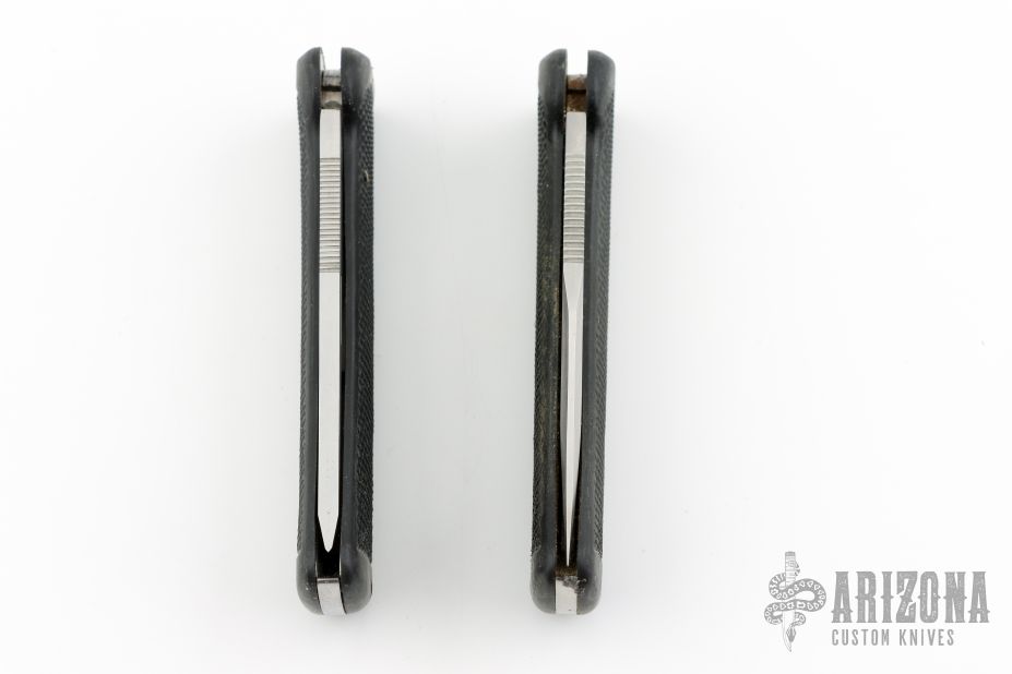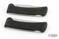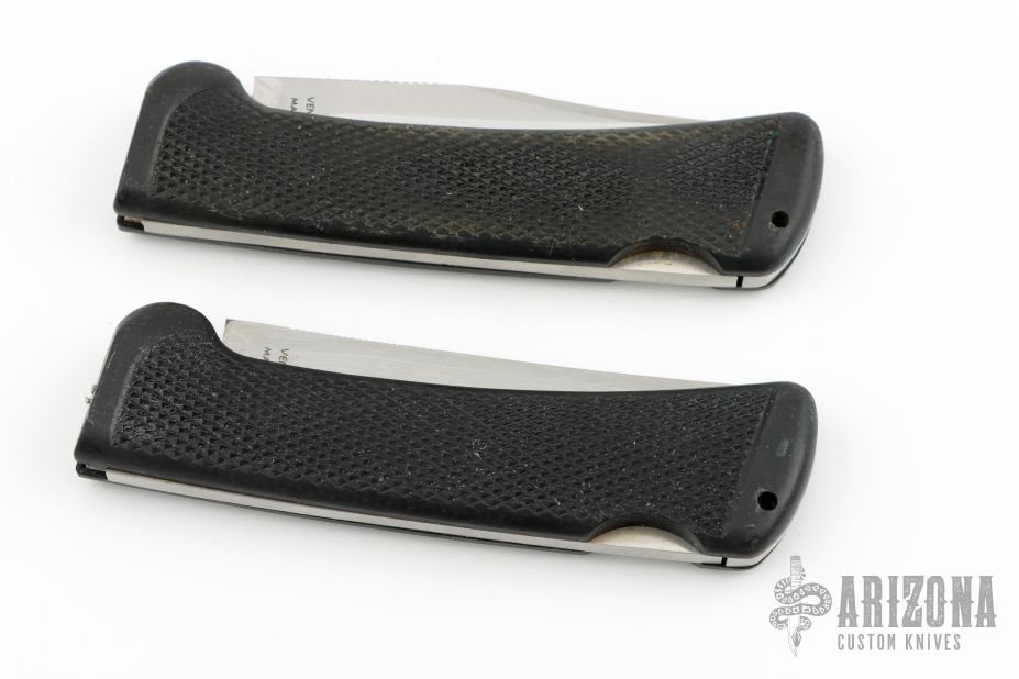 This Cold Steel Lockback has a satin finished blade with a single nail nick.  The handle features black rubber scales over steel liners and backspring.  Has scuffs, scratches, and patina. Good condition otherwise. Comes with original nylon sheath.