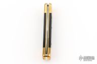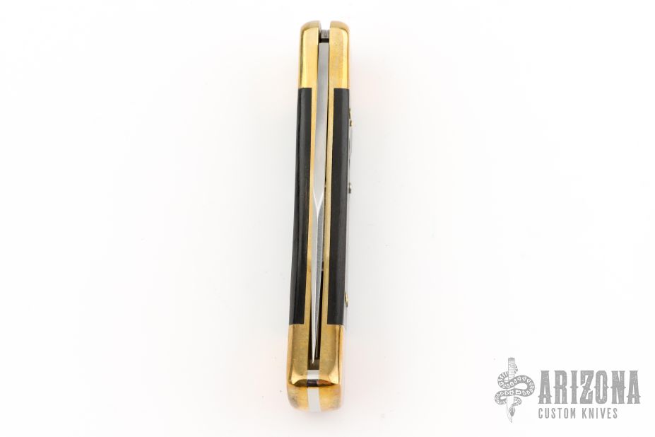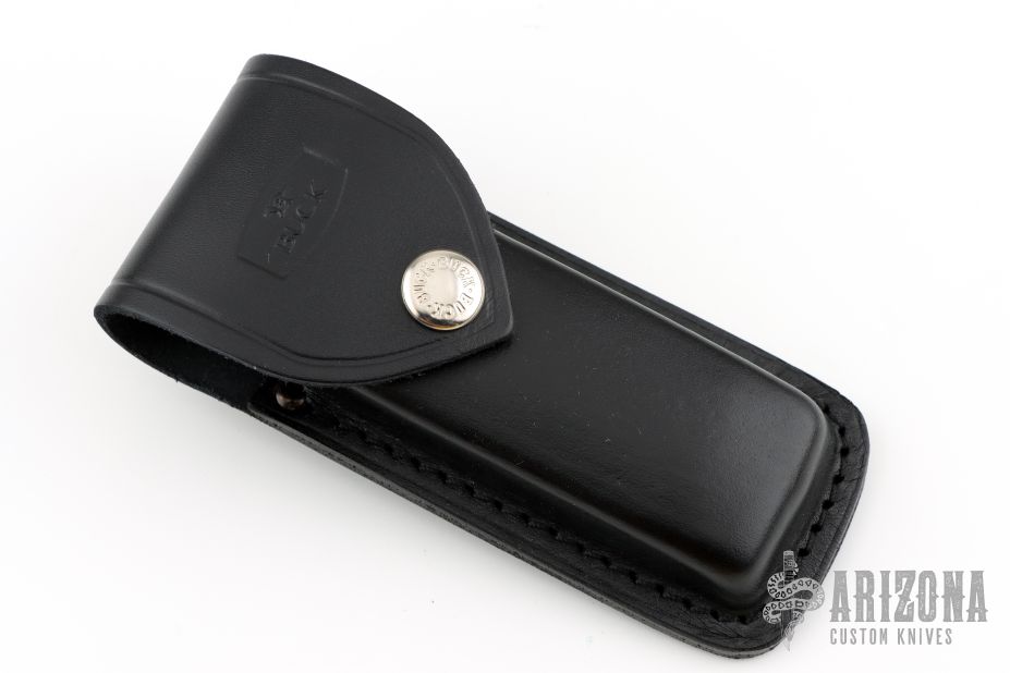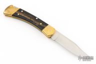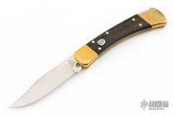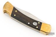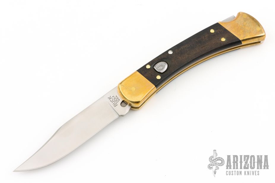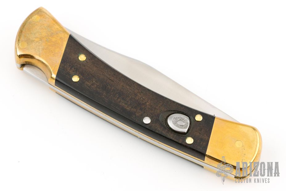 This Buck 110 Auto features a satin finished clip point. The handle has a brass frame with wood scales. Comes with original box and black leather sheath. Excellent condition.