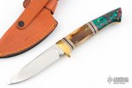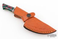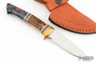 This Hunter by RW Wilson features a mirror finished drop point blade, .135" blade stock and .880" blade depth, hidden/frame tang construction. The handle has a brass guard, giraffe bone and acrylic scales and white/red/black/brass spacers, brass frame. Comes with a brown leather sheath. Has some light scratches, otherwise excellent condition. This knife is not marked with his logo.
