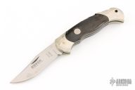 This Lockback Folder (2007) has a satin finished stainless steel clip point blade with nail nick. Scales are horn with Boker emblem inset, nickel silver bolsters, nickel silver liners, stainless steel back spacer, and lanyard hole. Comes with Boker leather belt sheath. Has scuffs, scratches, patina, and verdigris. Sheath has verdigris, and there are some chips in the handle material. Poor condition.