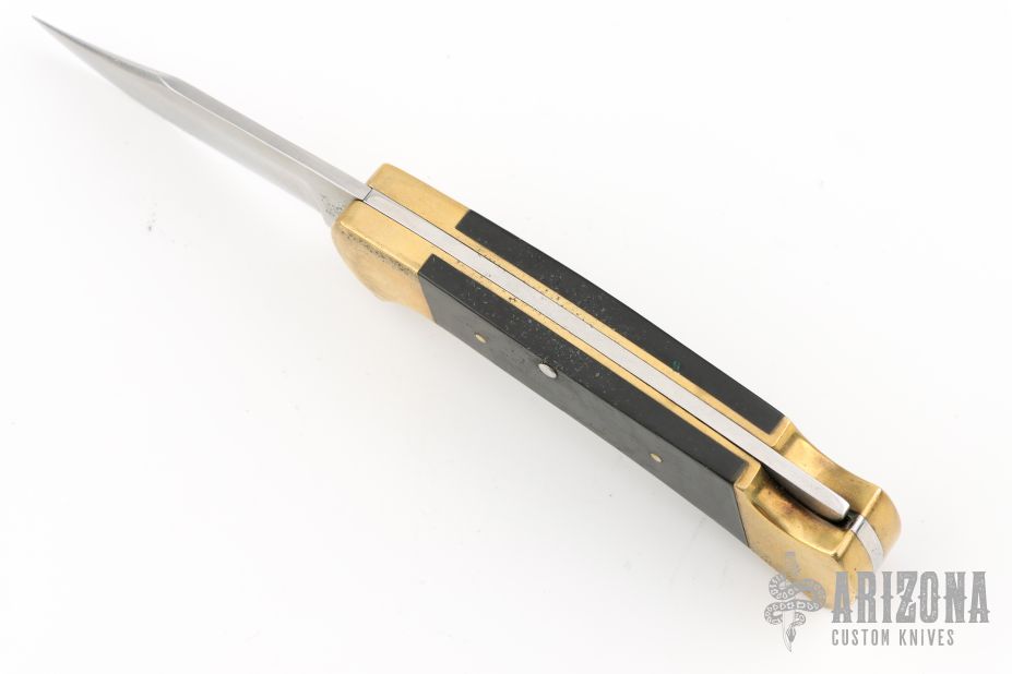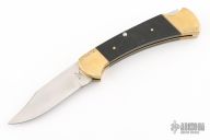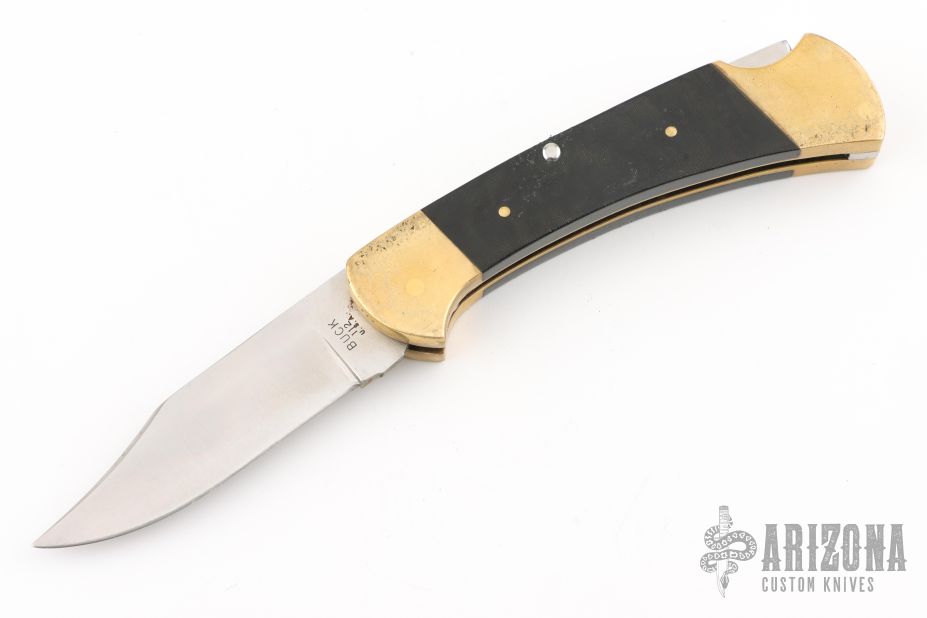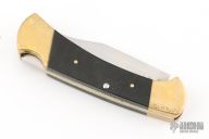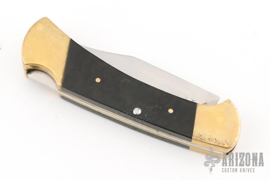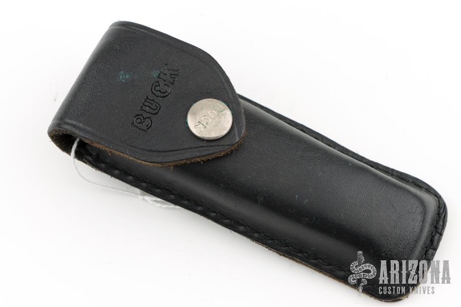 This Buck 112 features a satin finished clip point blade with nail nick. The handle has a brass frame with micarta scales and a stainless steel backspacer. Comes in a Buck leather belt sheath. Has scuffs and scratches. Has been resharpened. Great condition otherwise.