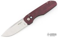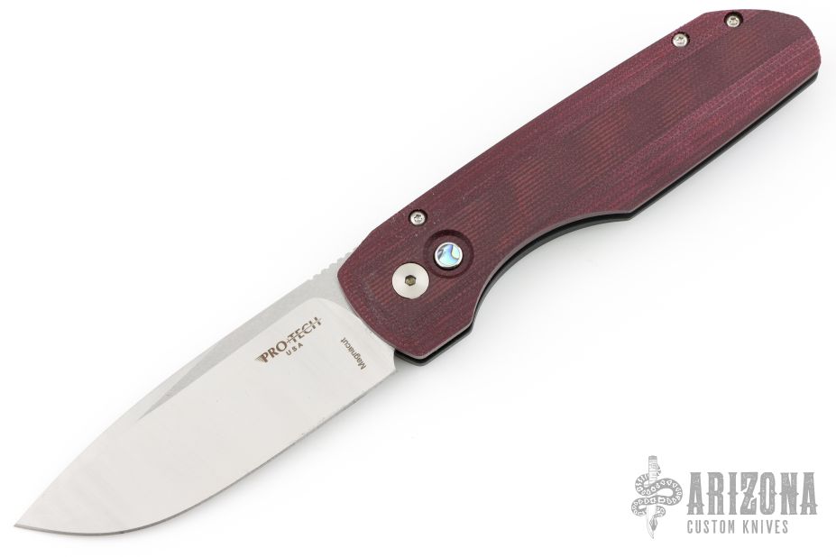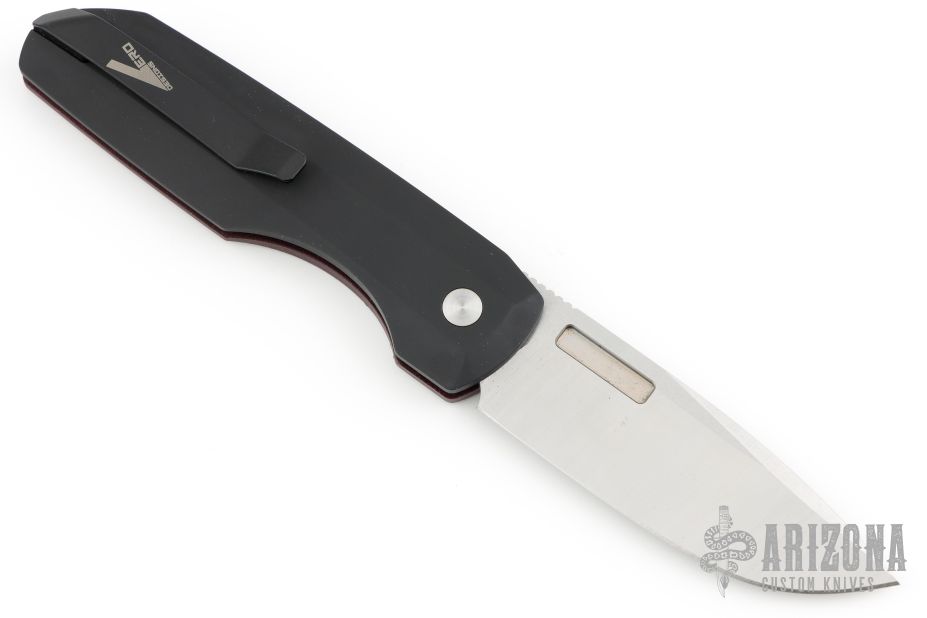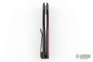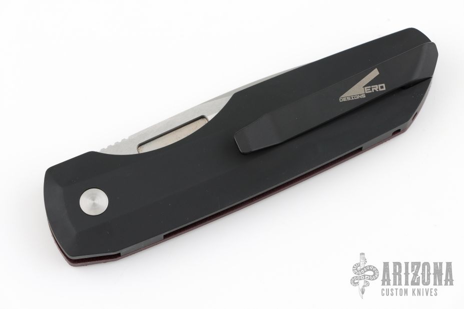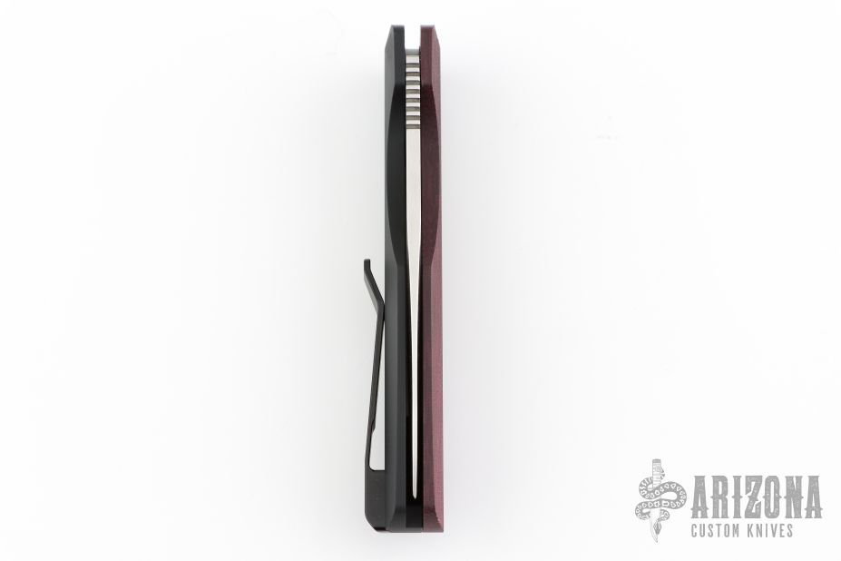 This Synapse Black LTD by Pro-Tech is a Vero Engineering design. It has a satin finished blade with notched thumbrest. The handle has a burgundy canvas micarta and black aluminum frame, abalone push button, tip up black titanium clip with hidden screws. Comes with original box and papers. New from maker.