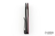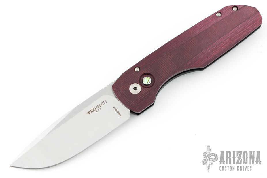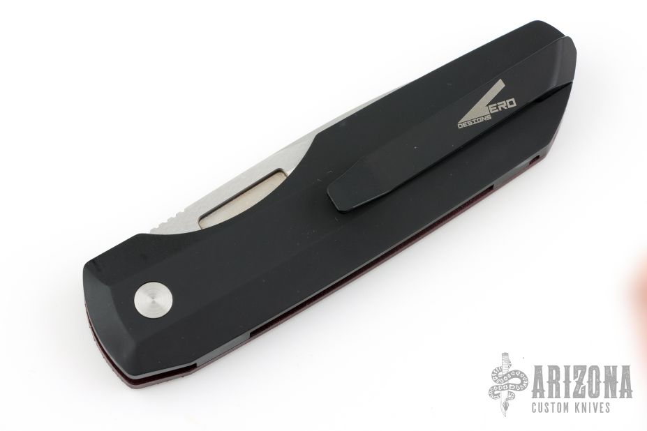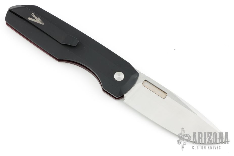 This Synapse Black LTD by Pro-Tech is a Vero Engineering design. It has a satin finished blade with notched thumbrest. The handle has a burgundy canvas micarta and black aluminum frame, abalone push button, tip up black titanium clip with hidden screws. Comes with original box and papers. New from maker.