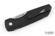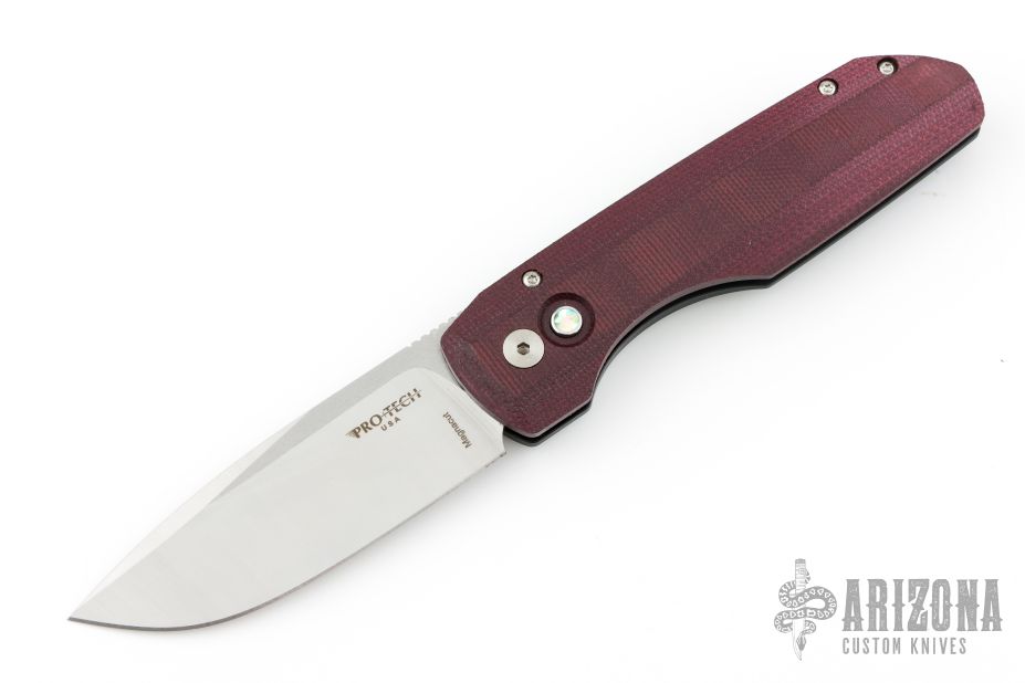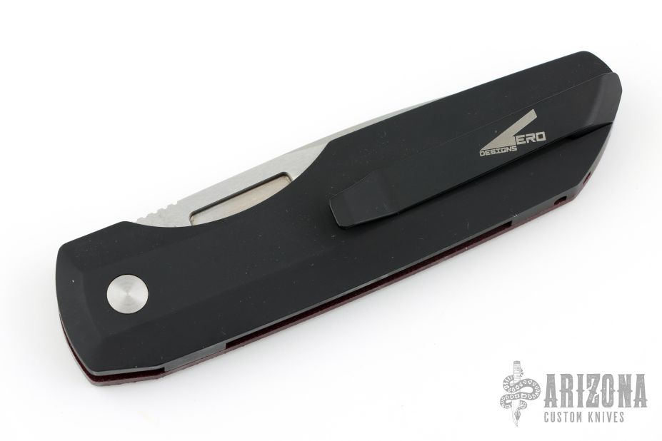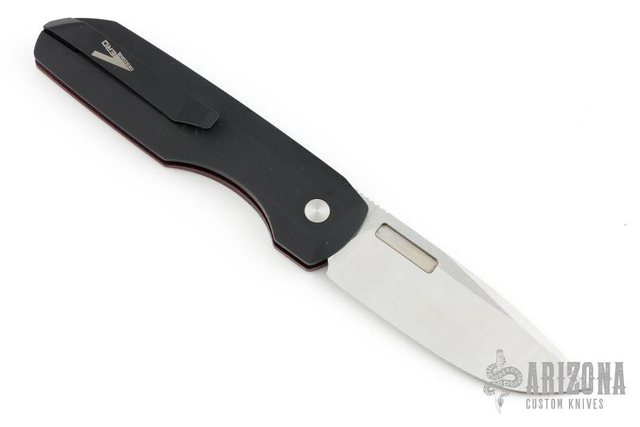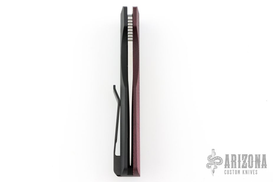 This Synapse Black LTD by Pro-Tech is a Vero Engineering design. It has a satin finished blade with notched thumbrest. The handle has a burgundy canvas micarta and black aluminum frame, abalone push button, tip up black titanium clip with hidden screws. Comes with original box and papers. New from maker.