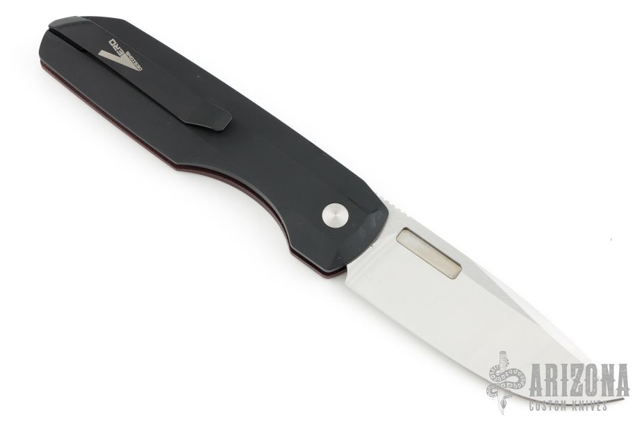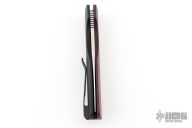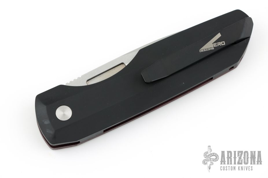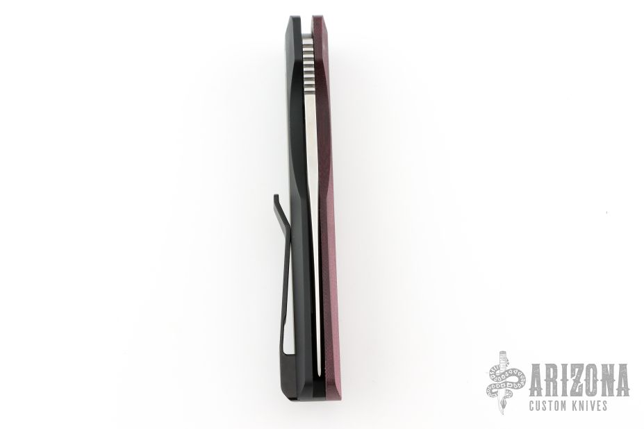 This Synapse Black LTD by Pro-Tech is a Vero Engineering design. It has a satin finished blade with notched thumbrest. The handle has a burgundy canvas micarta and black aluminum frame, abalone push button, tip up black titanium clip with hidden screws. Comes with original box and papers. New from maker.