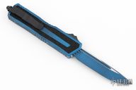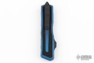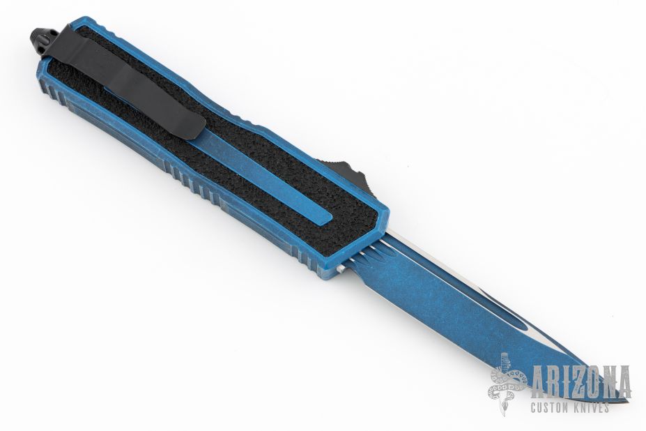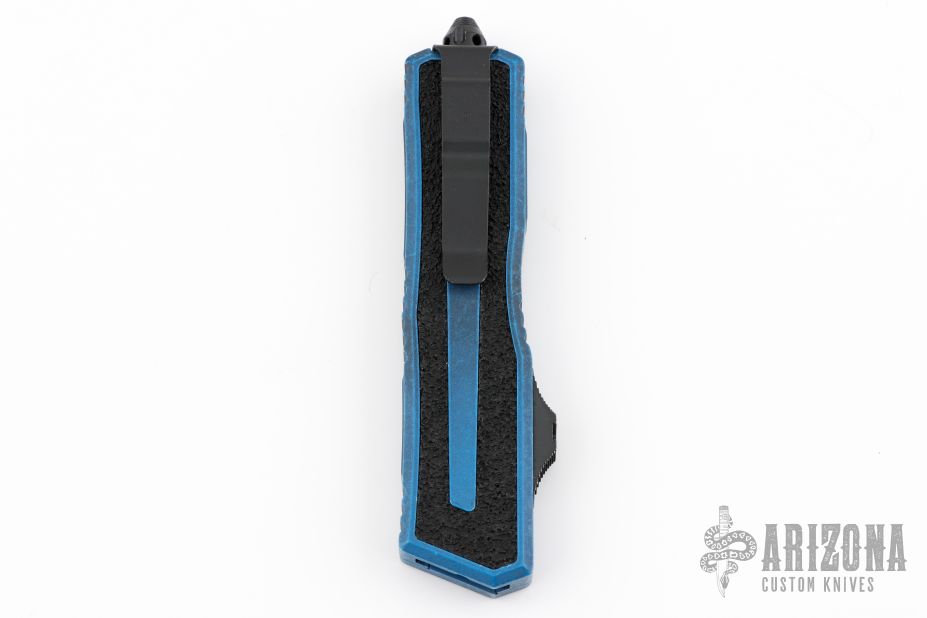 This Scarab II Gen III by Microtech features a weathered blue stonewash finished blade with fullers. The handle has a blue aluminum handle with non-slip inserts, a single glass breaker and tip down stainless steel clip. Has a couple light scuffs, excellent condition otherwise.