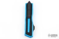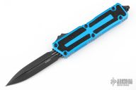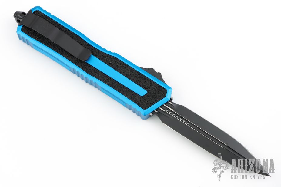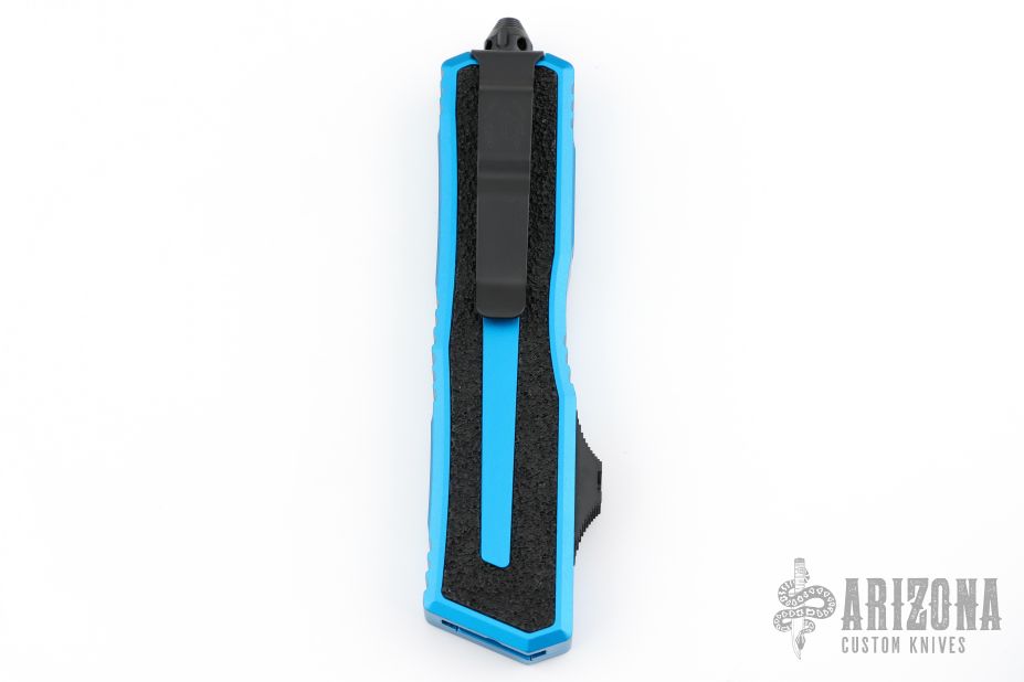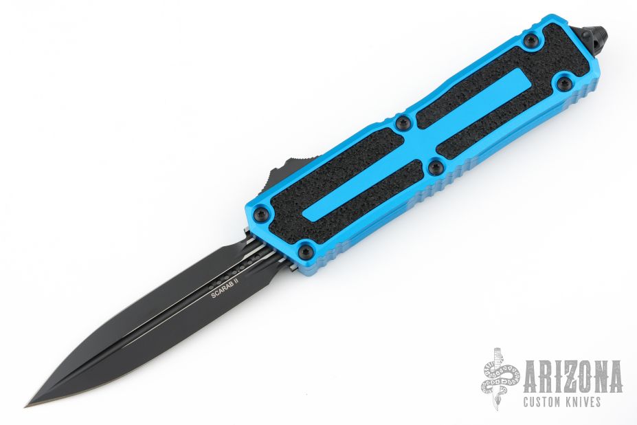 This Scarab II Gen III by Microtech features a black finished blade with fullers. The handle has a blue aluminum handle with non-slip inserts, a single glass breaker and tip down stainless steel clip. Has a couple light scuffs, excellent condition otherwise.