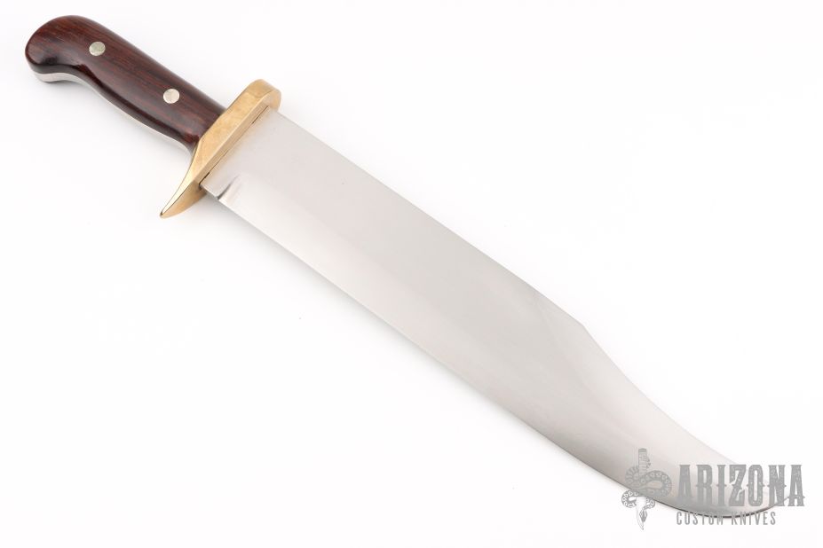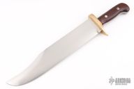 This Giant Bowie by Terry L Stover features a hand rub satin finished blade with false top edge, .330" blade stock and 2.602" blade depth, full tang construction. The handle has a brass guard and cocobolo scales with nickel silver pins. Has some light scratches, otherwise excellent condition. This is one massive piece of Stellite!