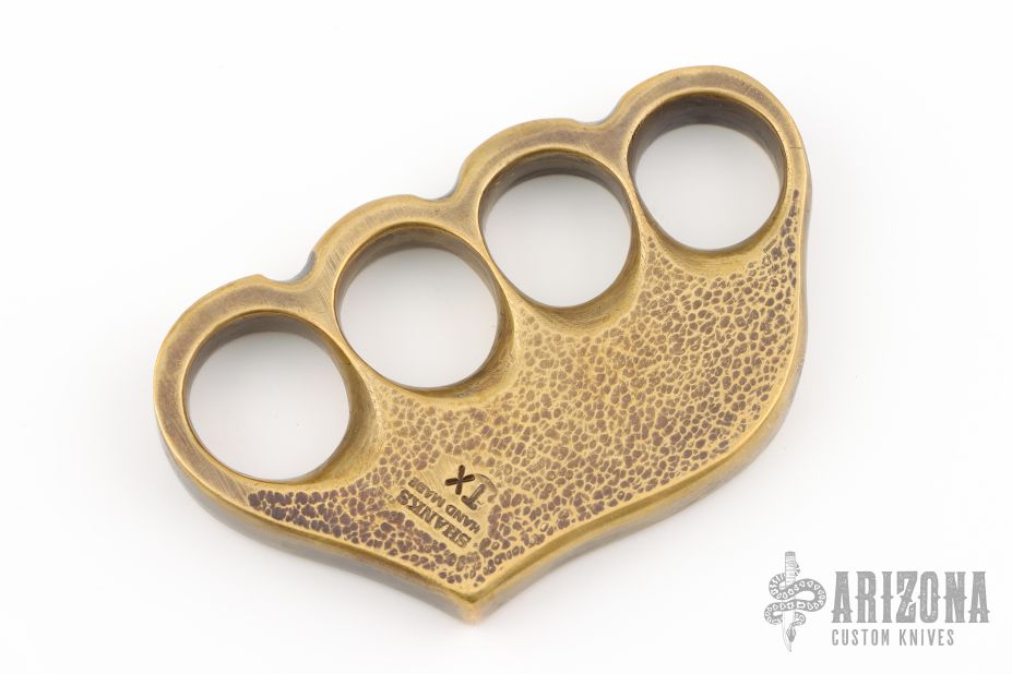 Custom Brass Knuckles by Terry Shanks. Stipple texture, 4.25" wide, .5" thick. Has some scuffs, scratches, and patina. Excellent condition otherwise.