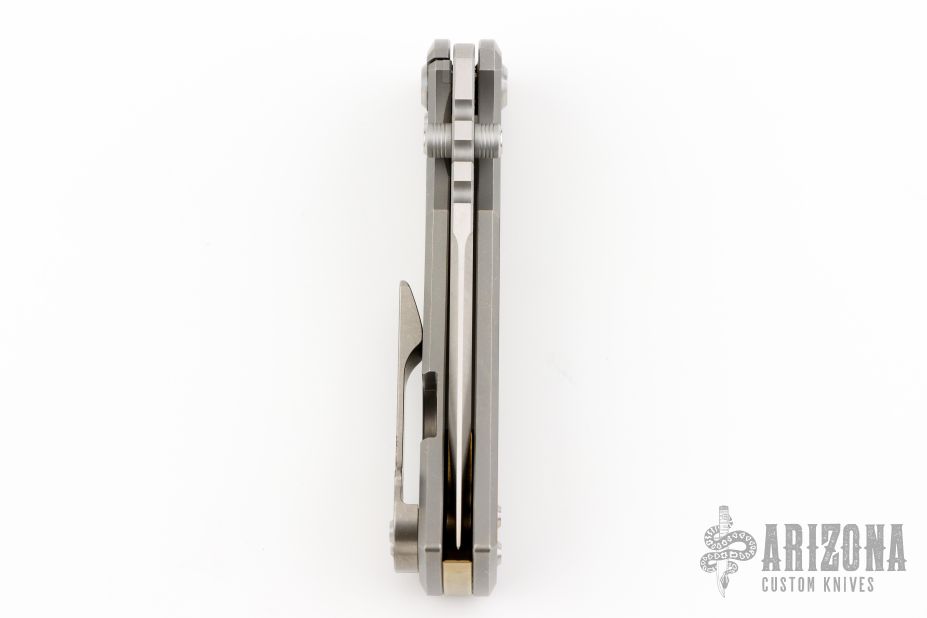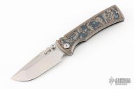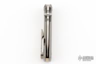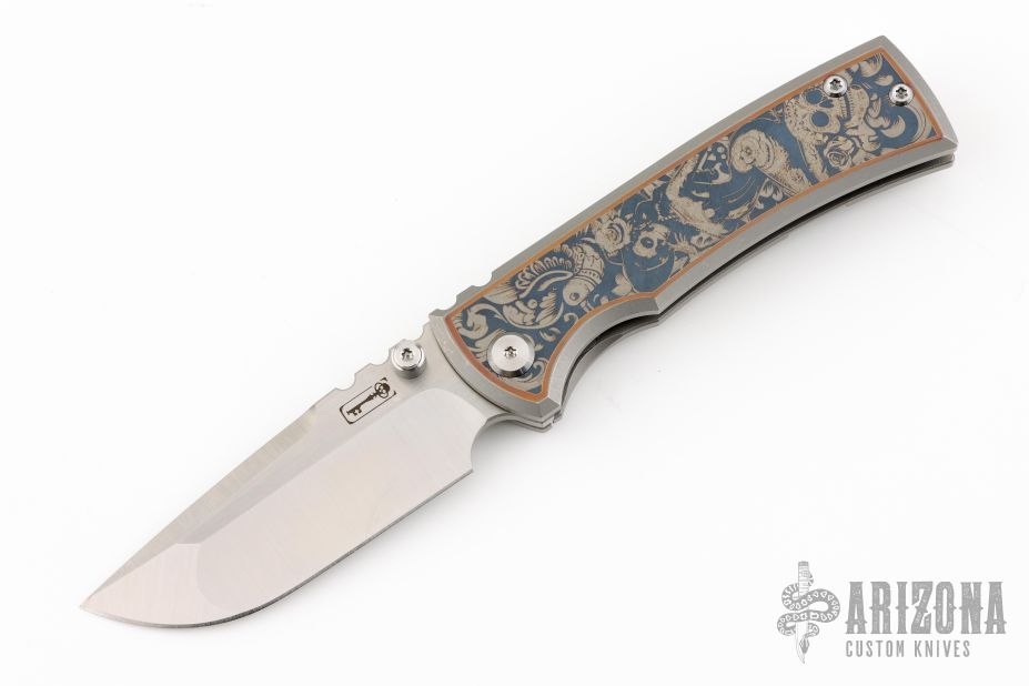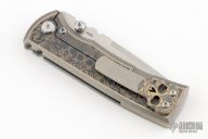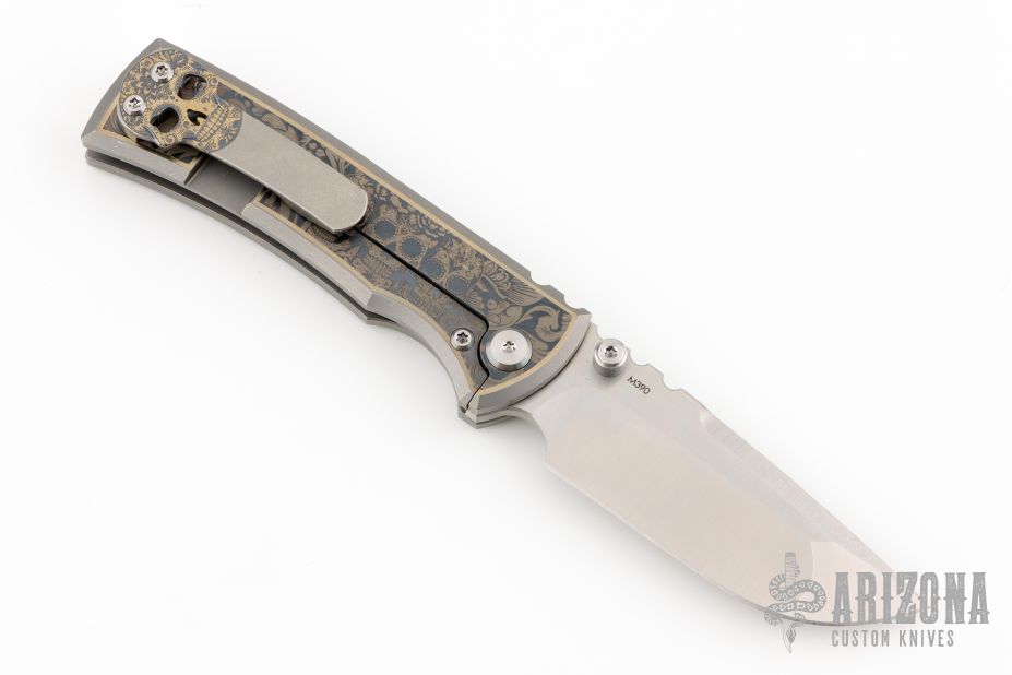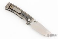 This Chaves Ultramar Redencion Street Drop point features a satin finished blade with the Chaves logo. The handle is made up of tumbled titanium, skull pocket clip (positioned for tip up carry), and a matching titanium backspacer. Handle has been nicely laser engraved. Has some light scuffs, and scratches, great condition otherwise.