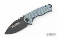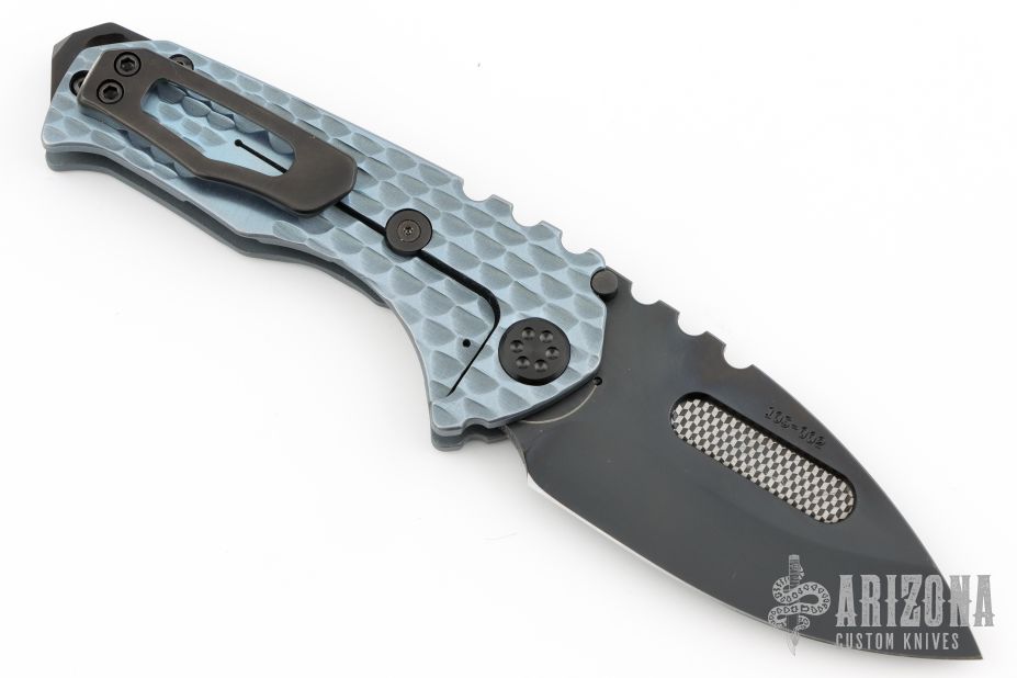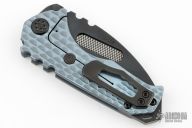This Praetorian Genesis by Medford Knife and Tool features a black drop point style blade with fullers and notched thumb rest. Fullers are laser engraved. The handle is comprised of machined and anodized titanium over a D2 backspacer/glass breaker with lanyard bail. The black, machined titanium tip up clip is positioned for right hand carry. Has a couple light scuffs and scratches, excellent condition otherwise.