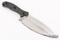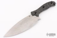 This knife by American Kami has a satin finished multi-ground blade with full tang and notched thumbrest, false top edge, .217" blade stock, 2.142" blade depth. Handle has carbon fiber with exposed tang butt/glass breaker, and lanyard hole. Has a couple light scratches, and one small oxidation spot, otherwise excellent condition.