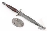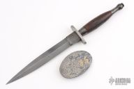 This Fairbairn Sykes style dagger was made by Paul Chen for CAS Iberia, it features as double edged Damascus blade with .201" blade stock and .862" blade depth, hidden tang construction. The handle has an engraved stainless steel guard, stacked leather grip with Damascus butt and collar. Comes with a wooden display box and a matching Damascus belt buckle with "FS" inlaid in gold. Excellent condition.