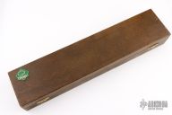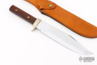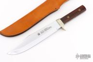 This Original Bowie by Puma features a mirror finished blade with false top edge, .186" blade stock and 1.958" blade depth, full tang construction. The handle has a nickel silver guard, rosewood scales. Comes with original brown leather sheath and wooden box. Has some light scratches, some oxidation on the tang, otherwise excellent condition.