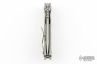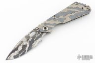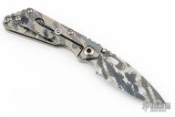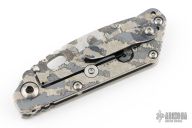 This Mick Strider SNG framelock folder features a drop point blade with thumbhole and notched thumbrest. The handle has a digicam titanium frame with titanium clip, tip up carry. Jimping on blade spine. Includes Hinderer "Lock Bar Stabilizer" for maximum reverse lock retention. Nice detent, lockup and blade seating. New condition.